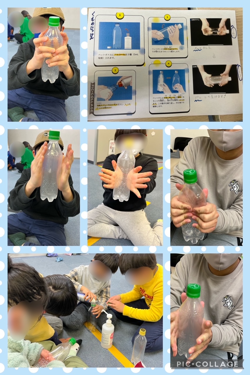 1月26日の活動は、ペットボトルの中に雲を作る実験でした!消毒用アルコールを少し入れたところに消臭スプレーを吹きかけ、手で少し温めます。ギュッと押して、パッと離すと…ペットボトルの中が曇りました!☁️「雲、出来たよ!」「もう1回やってみるね!」とお部屋の中でも雲ができるのを楽しみました☺️