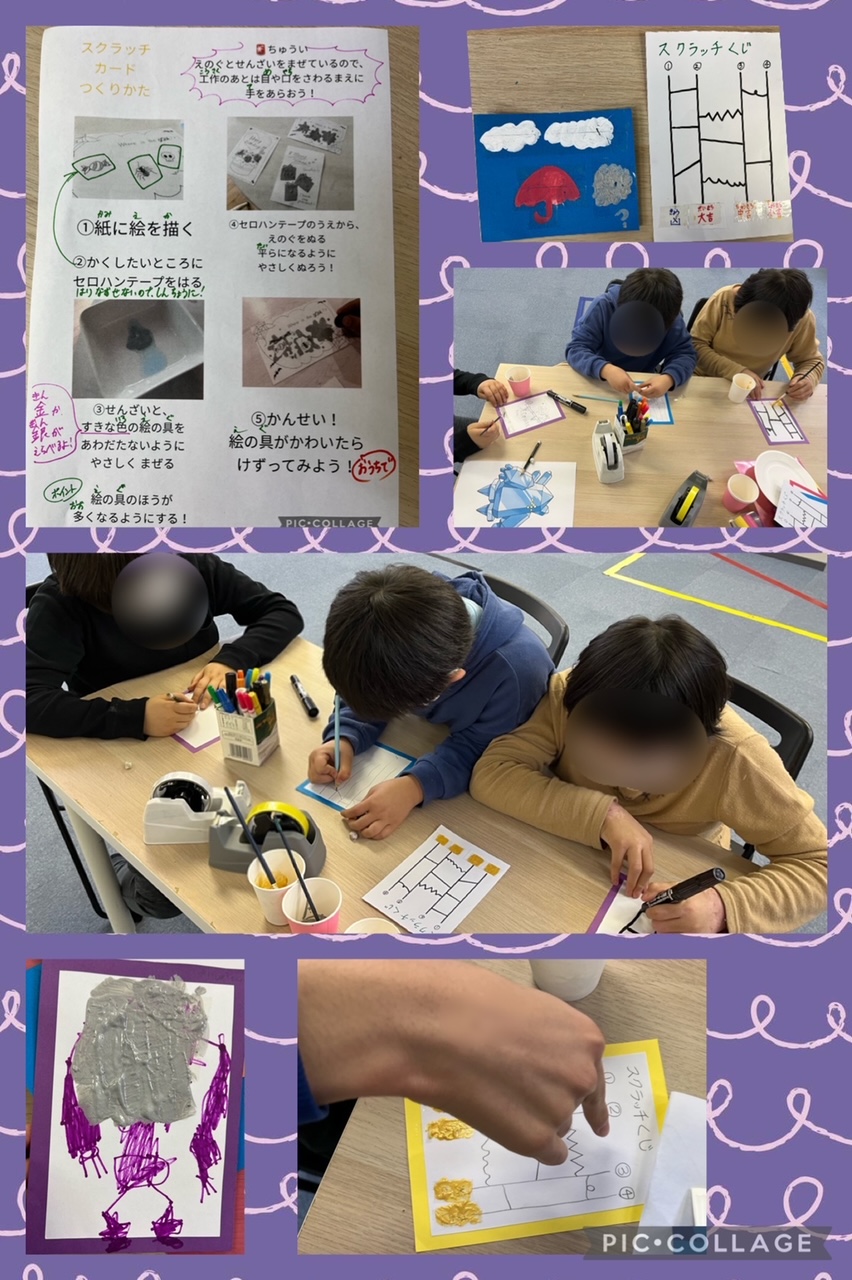 1月11日の活動は、スクラッチカード作りでした!絵を描いた上からセロハンテープを貼り、絵の具と食器用洗剤を混ぜて、その上から塗ると…乾くと削れるスクラッチカードの完成です✨今日中には乾かなかったため、見本を試しに削って楽しみました☺️あみだくじのゴールを隠したり、ロボットの顔を隠したり、思い思いにできました🪙